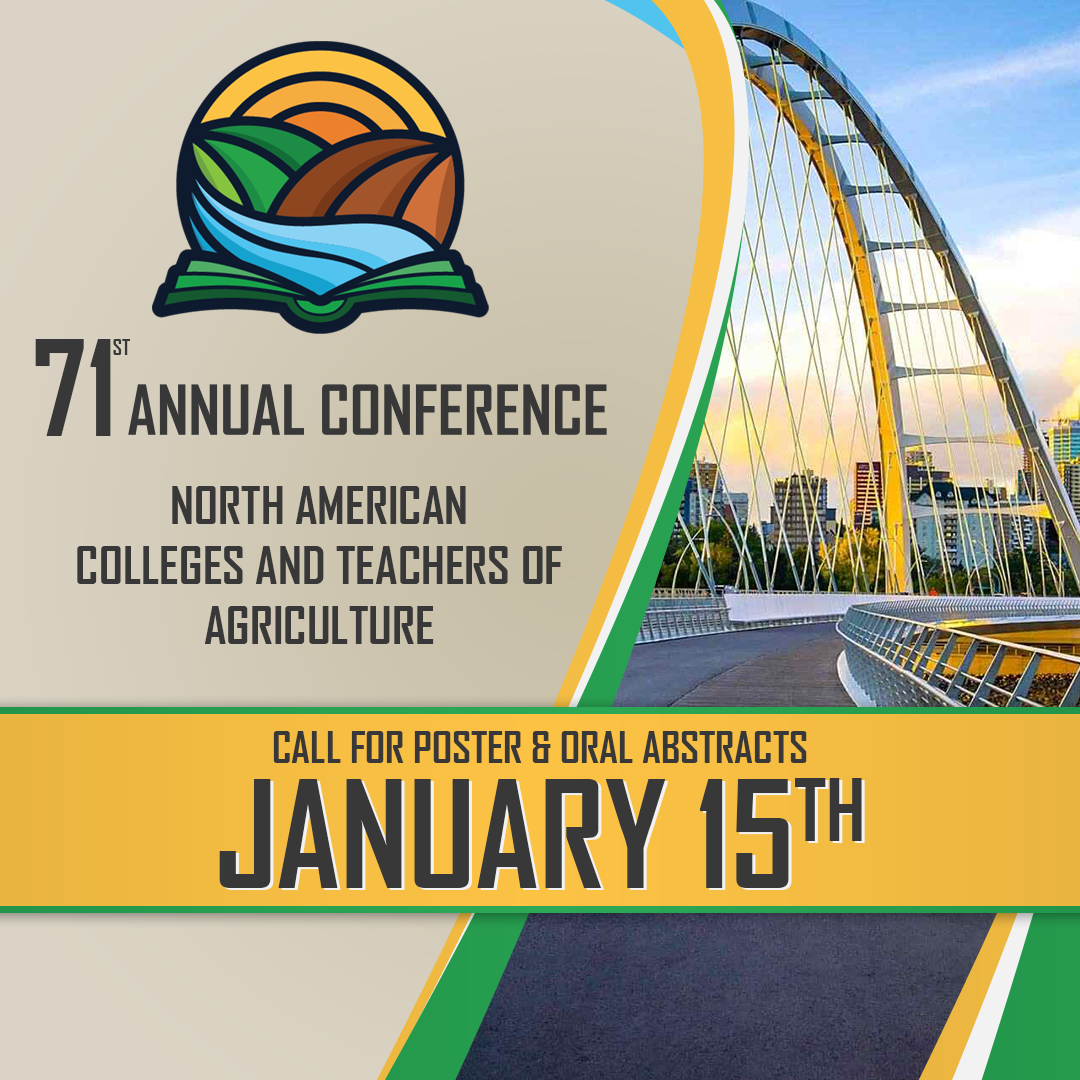 North American Colleges and Teachers of Agriculture (NACTA) is pleased to announce the call for abstracts for poster and oral presentations for the NACTA Conference to be held in Edmonton, Alberta, Canada, from June 2-6, 2025. The NACTA conference provides opportunities to connect with and learn from others who share the same passion for the improvement of teaching and learning in agriculture, food, and natural resources. The Annual NACTA Conference will provide you with new teaching techniques, ideas, and resources. It is also one of the best professional development activities for networking with other teaching professionals where the common discipline is “teaching.”